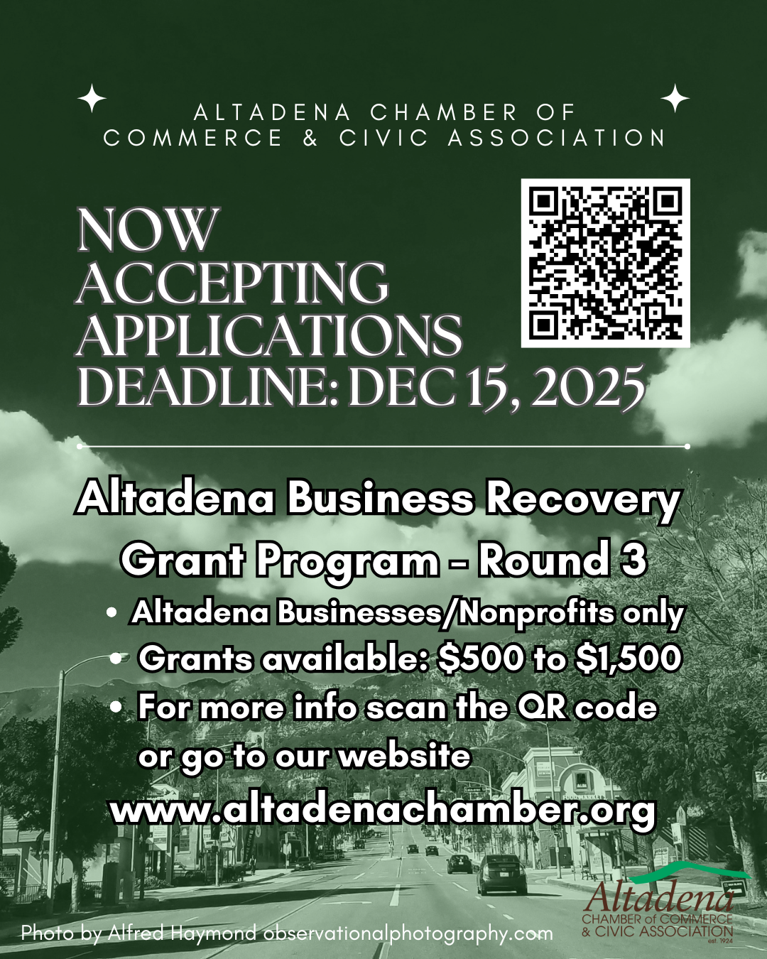 The Altadena Chamber of Commerce receives donations through its Fiscal Sponsorship with the Pasadena Chamber of Commerce Foundation, a California nonprofit corporation (Tax ID: 82-1823970), tax-exempt under Section 501(c)(3) of the Internal Revenue Code.